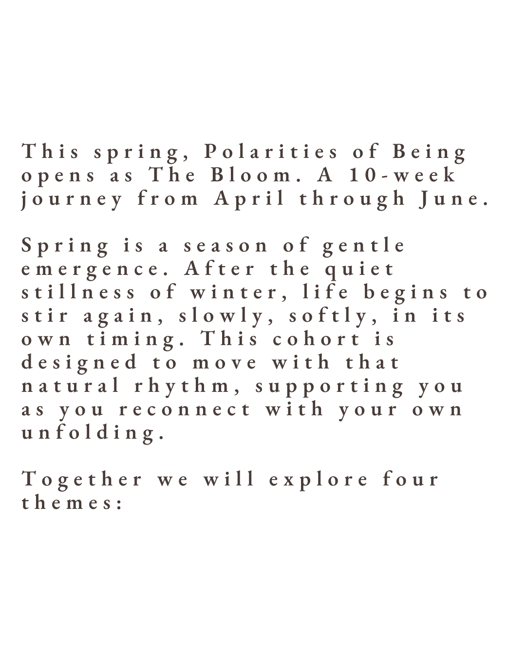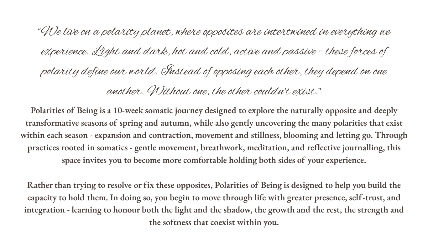 Polarities of Being is held within a small group container where you’re supported not only by the practices, but by the presence of others walking a similar path. this space encourages connection, shared reflection, and the quiet reassurance that you don’t have to move through growth alone.